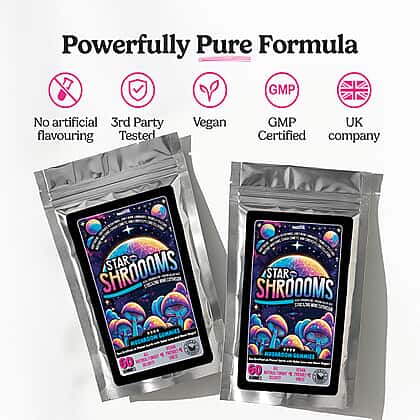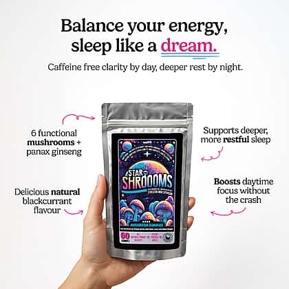 Fuel your day and calm your night with Innooova Starshrooms Gummies – a powerful blend of six functional mushrooms and panax ginseng. Each gummy supports mood, energy, focus and restful sleep with a delicious blackcurrant flavour. These vegan, gluten-free treats are designed for natural balance and brain clarity without the caffeine crash. Crafted with Lion’s Mane, Cordyceps, Reishi and more, they help you stay sharp, sleep well, and feel better daily. Take two gummies daily to unlock your best self with every bite.
