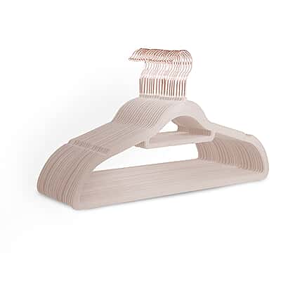 Add a pop of charm to your wardrobe with this blush pink set of Keplin Velvet Hangers. With a pack of 20, each hanger is thoughtfully made from strong ABS and soft velvet for secure, no-slip storage. Their slimline profile helps maximise space, while the curved shape maintains garment form. Perfect for delicate pieces, the plush texture prevents damage and slipping. A rotating chrome hook and handy tie bar give you convenience and control. Whether revamping your wardrobe or just adding flair, these blush hangers offer beauty with everyday function.