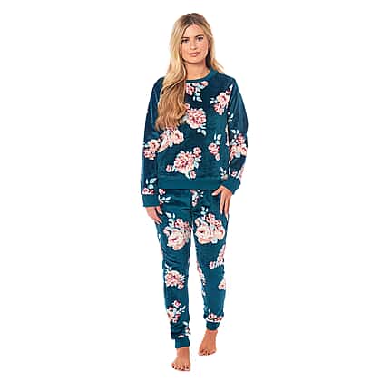 Ladies Floral Printed Flannel Fleece 2 Piece Crew Neck Pyjama Set - Green