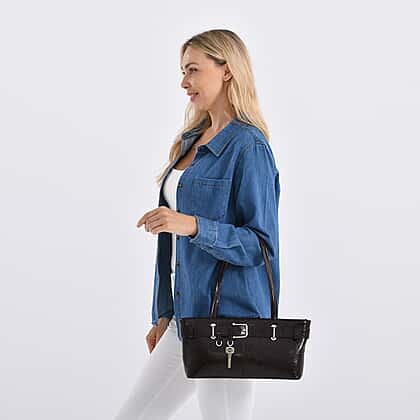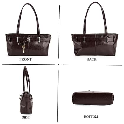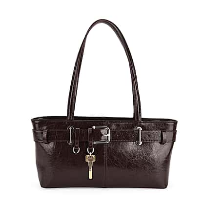Celebrate lasting style with this genuine rectangular leather handbag, featuring a belt buckle design in classy, gleaming coffee colour finish. Expertly crafted with premium, genuine leather, this handbag ensures durability and a lasting finish. Specious yet luxurious, the rectangular shape of the bag offers enough space. The belt buckle enhances its beauty, making it suitable for classy evenings, and exudes a charm that only genuine leather can offer.
