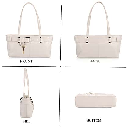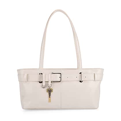 Celebrate lasting style with this genuine rectangular leather handbag, featuring a belt buckle design in classy, gleaming white finish. Expertly crafted with premium, genuine leather, this handbag ensures durability and a lasting finish. Specious yet luxurious, the rectangular shape of the bag offers enough space. The belt buckle enhances its beauty, making it suitable for classy evenings, and exudes a charm that only genuine leather can offer.