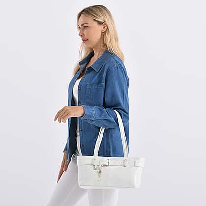 Genuine Leather Belt Buckle Design Rectangular Handbag- White