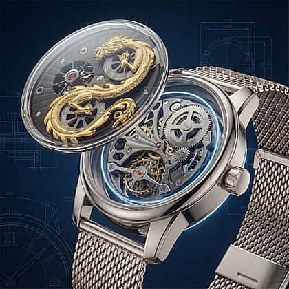 Designed to stand apart, the William Hunt London Dragon Watch brings statement artistry to everyday wear. The 42mm stainless steel case frames a striking dial featuring a sculpted golden dragon beneath a durable blue sapphire crystal glass. An automatic mechanical movement delivers smooth, self-winding performance with a 36-hour power reserve and luminous detailing for easy reading. The skeleton design reveals inner mechanics, adding depth and intrigue. Water resistant to 5 ATM, it suits daily life with confidence. Finished with an adjustable Milanese mesh strap, this limited edition watch balances bold character, precision engineering, and comfort for women drawn to distinctive design.