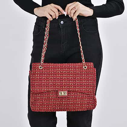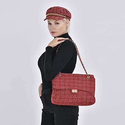 Closeout Deal- Combo Pack - Classic Checkered Pattern Shoulder Bag with Chain Strap - a Newsboy Cap - Red - Black