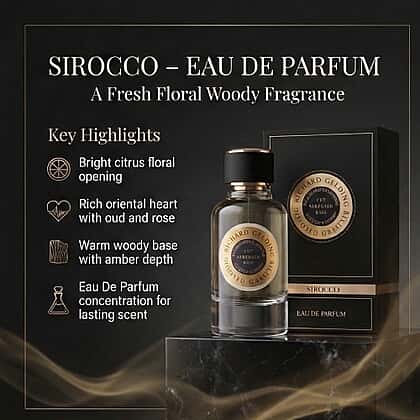 Richard Gelding Sirocco Eau de Parfum is crafted to deliver a layered fragrance experience inspired by warm oriental notes. The composition opens with fresh citrus and aromatic accords, gradually revealing a heart of soft florals balanced with subtle spice. As the scent settles, deeper base notes of amber, musk, and woody accords create a warm and lasting trail. Presented in a classic glass bottle with a navy cap and housed in a rich navy box with gold detailing, the design reflects the heritage of the Richard Gelding Mayfair fragrance house. Suitable for both daytime use and evening wear.