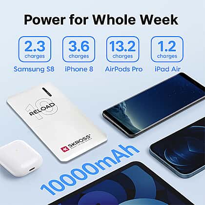 Stay powered up on the go with the Skross 10000mAh Powerbank—compact, sleek, and designed for convenience. With a 10,000mAh capacity, this power bank is perfect for topping up your devices when you're out and about. It features dual USB outputs, each delivering 5V/2A and a Micro USB input for recharging. Its lightweight, travel-friendly design makes it a must-have for frequent travellers or anyone needing reliable, portable power.