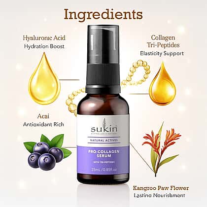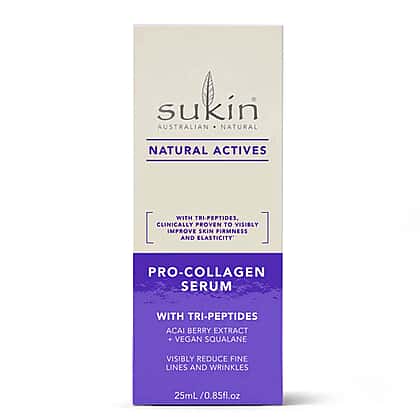 Reveal smoother, firmer skin with Sukin Natural Actives Pro-Collagen Serum 25ml, crafted to visibly reduce fine lines and restore youthful elasticity. This advanced anti-ageing formula blends clinically proven ingredients like Hyaluronic Acid and Collagen Tri-Peptides to deeply hydrate and plump the skin. Acai Berry, rich in antioxidants, supports a radiant complexion, while Vegan Squalane locks in moisture and enhances suppleness. Lightweight and non-greasy, the serum absorbs quickly, making it perfect for everyday use under moisturiser or makeup. Ideal for targeting early signs of ageing, it helps your skin appear revitalised, firmer, and naturally radiant with every application.