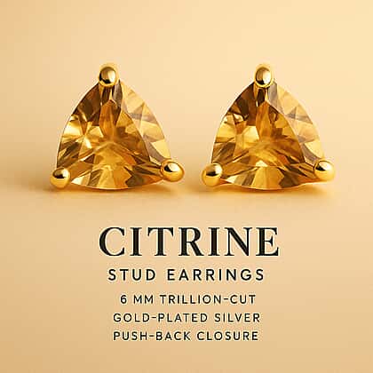 The stud earrings are designed in a solitaire pattern enameled Citrine gemstone. The earrings are settled with three prong setting. The gemstone is carved in 6mm trillion faceted cut weighing 0.65 grams. The earrings are crafted in sterling silver with gold plating. The gold plating adds extra shine to earrings. Simple push back clasp keeps the earrings in place.