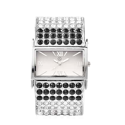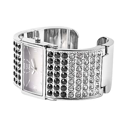 STRADA Japanese Movement Black and White Crystal Bangle Watch (Size 6.5-7) in Silver Tone with Black and White Gradient Dial