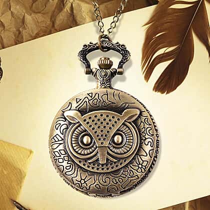 STRADA Japanese Movement Owl Pattern Pocket Watch with Chain (Size 31) in Antique Bronze Tone