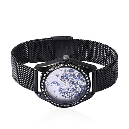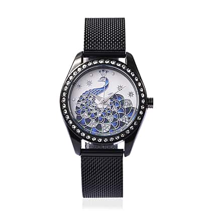 STRADA Japanese Movement Peacock Pattern Water Resistance White Austrian Crystal Studded Watch with Mesh Strap in Black Plating