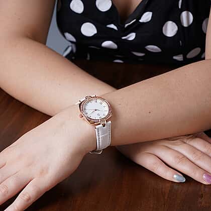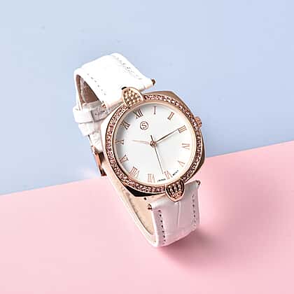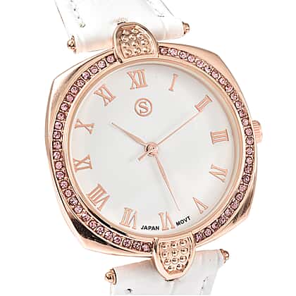 STRADA Japanese Movement Pink Crystal Studded Water Resistant Watch with White Strap