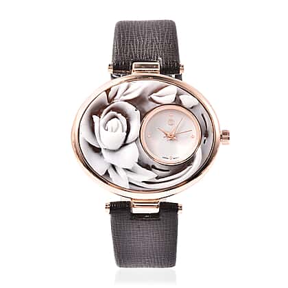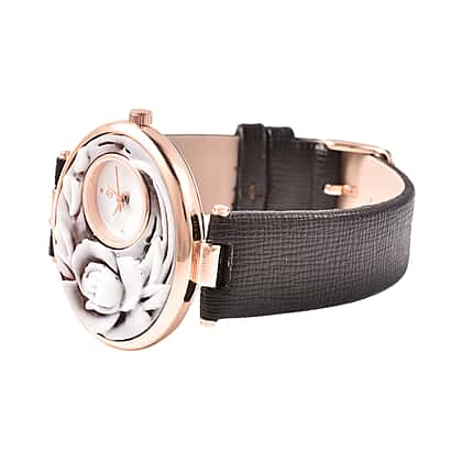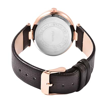 STRADA Japanese Movement Rose Carved Dial Rose Tone Watch with Dark Brown Strap