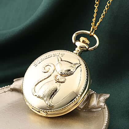 This Strada pocket watch can easily be seen as a Siamese cat watch. The Siamese breed of cats is engraved on the cover and provides a sweet texture for all cat lovers. The white-coloured literal dial with a black 12pcs number system is easily read. Crafted in high-quality iron and plated with gold, this pocket watch has a rich look with durability. The chain accompanying the watch is fastened through a lobster claw clasp and can be easily styled according to your utility.