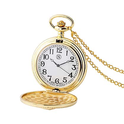 STRADA Japanese Movement Carved Siamese Water Resistant Pocket Watch with Chain in Gold Tone