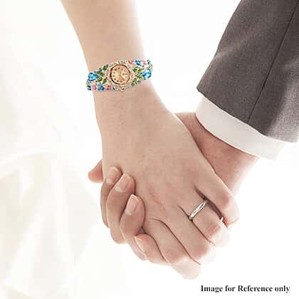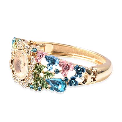 STRADA Japanese Movement Simulated Aquamarine and Multi Colour Austrian Crystal Floral Garden Theme Bracelet Watch in Gold Tone