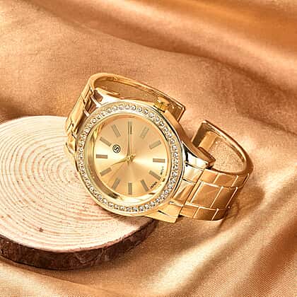 STRADA Japanese Movement White Austrian Crystal Cuff Bangle Watch - Yellow Gold Tone