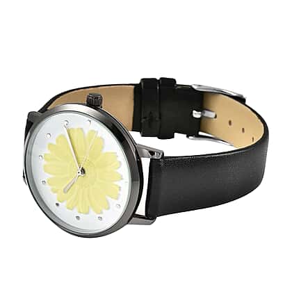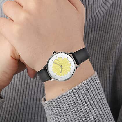 STRADA Japanese Movement Yellow Daisy Floral Water Resistant Watch with Black Colour Strap