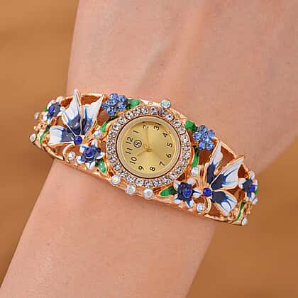 Infuse timeless elegance into your ensemble with the STRADA Multi-Colour Crystal & Enamelled Bangle Watch. This exquisite piece combines a watch's functionality with a bangle's beauty, featuring a gleaming gold-plated alloy case adorned with dazzling white crystals and multi-coloured enamel accents. The gold sunshine dial, complete with bold black numerals, is powered by reliable PC21S Japanese Movement, ensuring accurate timekeeping. The intricately designed alloy strap sparkles with rose glass stones and vibrant crystals, making it an artistic statement.