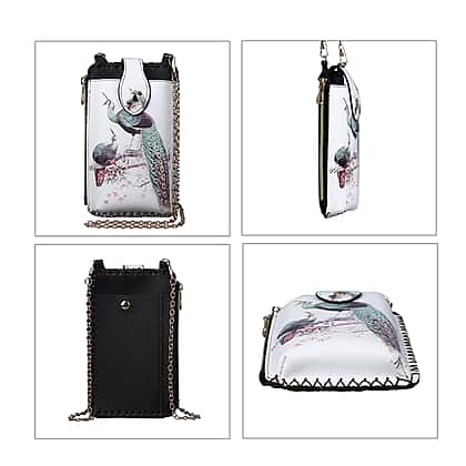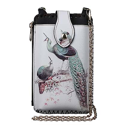 Stylish Peacock Pattern Mobile Phone Bag with Chain Shoulder Strap (Size 18x10cm) - White