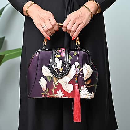 Silk & Leather Magnolia Pattern Bag with Handle Drop and Adjustable Shoulder Strap (Size 28x20x11cm) - Dark Purple