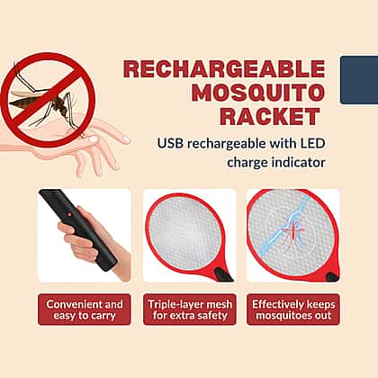 Keep your space insect-free with this rechargeable Mosquito Racket, designed for easy, chemical-free pest control. Built with a three-layer safety mesh and a dual trigger system, it ensures complete safety while effectively eliminating flying bugs. The USB rechargeable battery lasts long on a single charge, making it perfect for indoor use, travel, or outdoor settings. With its lightweight plastic build, ergonomic grip, and LED charge indicator, this versatile zapper is your reliable defence against mosquitoes, flies, and pests—allowing you to sleep peacefully every night.