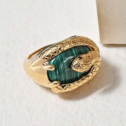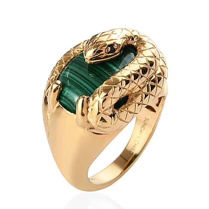 Sunday's Child 1 Ct Malachite and Boi Ploi Black Spinel Snake Ring in Yellow Gold Plated Sterling Silver