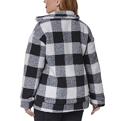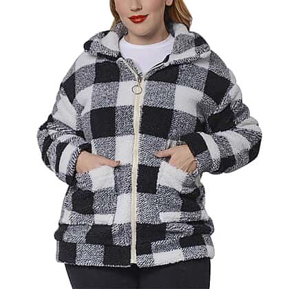 Black and White Checkered Pattern Faux Fur Coat with Pockets
