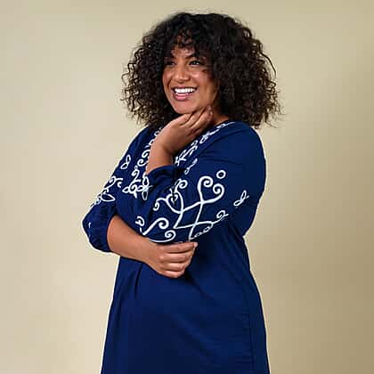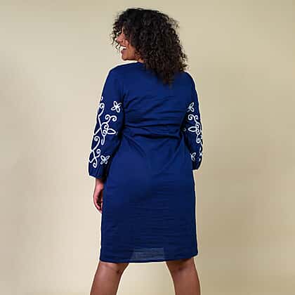 Elevate your everyday look with this V-neckline women's dress exclusively from Tamsy. The contrasting embroidered pattern around the neckline and on the sleeves elevates the look of this women's dress. The loose fit silhouette is made from the finest quality of cotton fabric to keep you at ease all day long. The striking navy colour gives a vibrant appeal to this dress and lets you style it with high heels or flats for a casual edge.