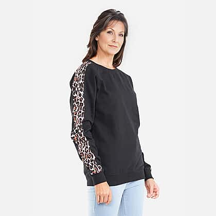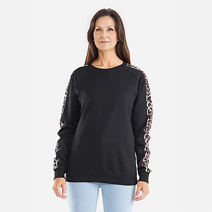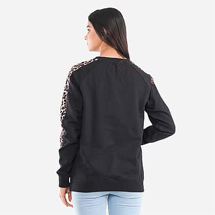 TAMSY 100% Cotton Leopard Pattern Sleeve Fleece Sweatshirt (Size S) - Black