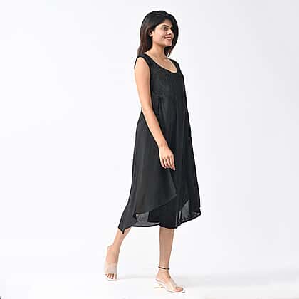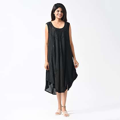 Tamsy Viscose Umbrella Dress with Sequin Floral Embroidery - Black