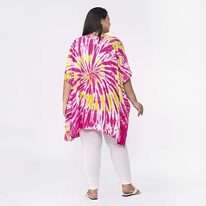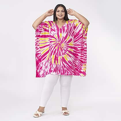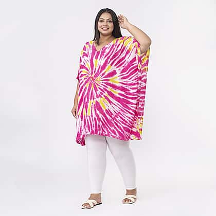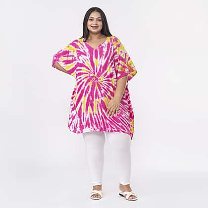 Style this colourful tie-dye print short kaftan for your summer vacation. It has a loose fit, elbow-length sleeves and a trendy v-neck line. Pair it with your favourite sandals and sunglasses for a stylish look.