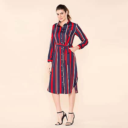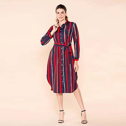 Elevate your wardrobe in this women's knee-length dress from Tamsy. Made from breathable, lightweight and silky soft American Crepe fabric to keep you comfortable and provide a luxurious finish. The eye-catching vertical striped pattern and knee-length silhouette make this dress perfect for parties and evening outs. Designed with button closure and a belt to conveniently personalise the fit. Wear it with your favourite pair of wedges for a look you can rock all year long.
