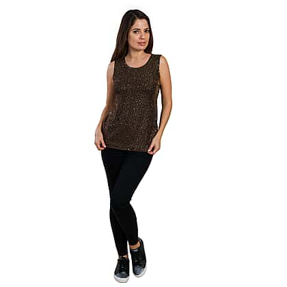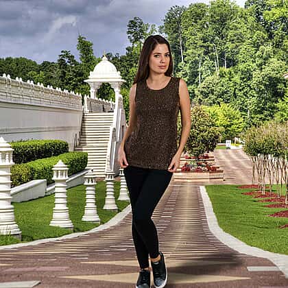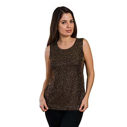 When you are heading towards a party or casual get together with friends, this dazzling top is a perfect option. The black and golden colour combination gives a contrasting appeal to this women's top, while the eye-catching embellishment detailing offers a sparkling appearance. Made from soft and lightweight fabric to keep you at ease around the clock. The sleeveless design of this top lets you wear it under jackets or cardigans.
