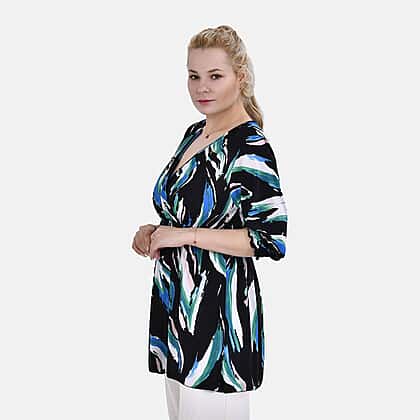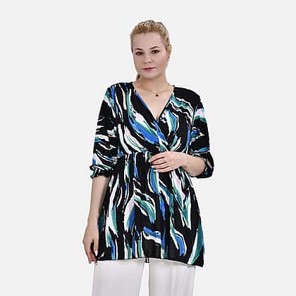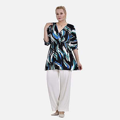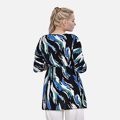 Tamsy Smocked Waist V-Neck Top with Blue and Black Abstract Patterns