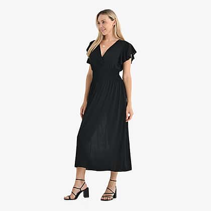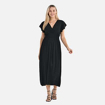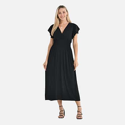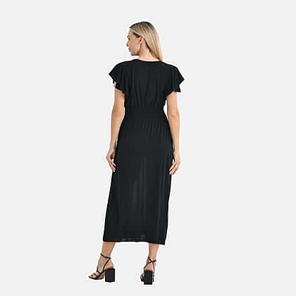 Tamsy Womens Flutter Sleeve V-Neck Smocked Midi Dress (One Size) - Black