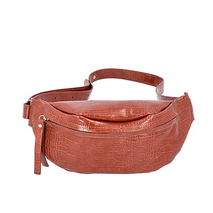Tan Croc Pattern Waist Bag with Zipper Closure (Size 28x10 Cm)