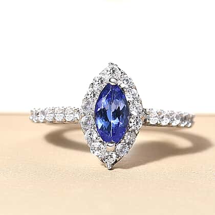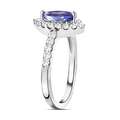 Halo Tanzanite Ring with Natural Cambodian Zircon in Platinum Plated Sterling Silver 1.13 Ct.