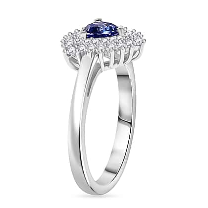 Tanzanite and White Zircon Halo Ring in Rhodium Overlay Sterling Silver