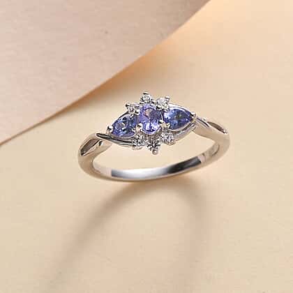A floral tribute to some you love, the stunning Tanzanite and White Zircon Three Stone Ring is going to bring her the smile you can never stop thinking about. The petite ring looks fabulous in Platinum Overlay Sterling Silver. Its designer appeal comes from the twisted shank that supports the three blue gemstones on prongs. The outline of the flower is created with sparkling white zircons.