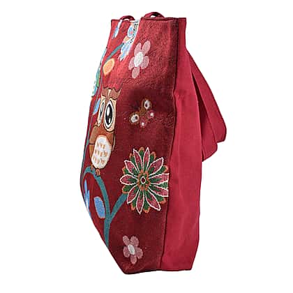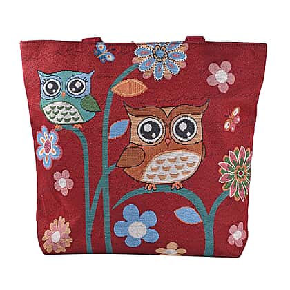 Tapestry Two Owls On Branch Large Tote Bag (H 34 cm x W 43cm) - Maroon