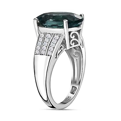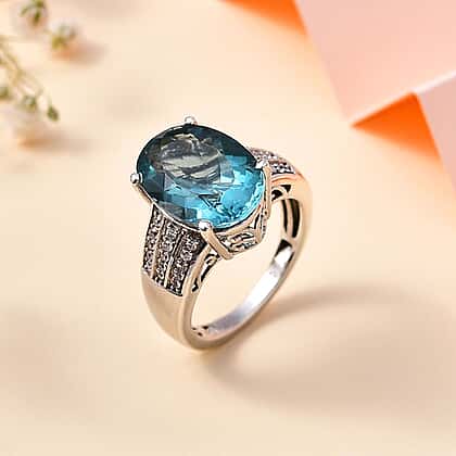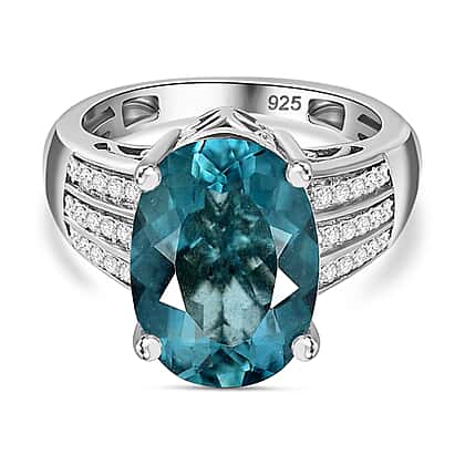 Belgian Teal Fluorite and Natural Zircon Ring in Rhodium Overlay Sterling Silver 6.96 Ct