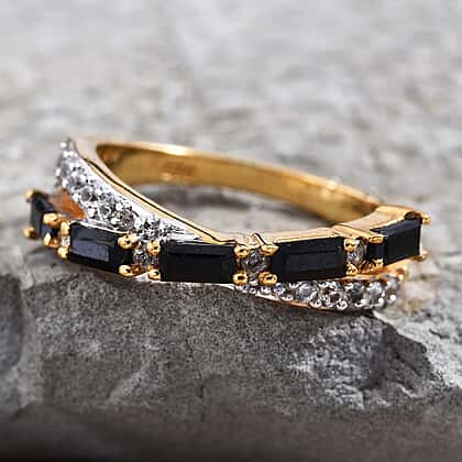 1 Carat Thai Black Spinel and Zircon Criss Cross Ring in 14K Gold Plated Silver