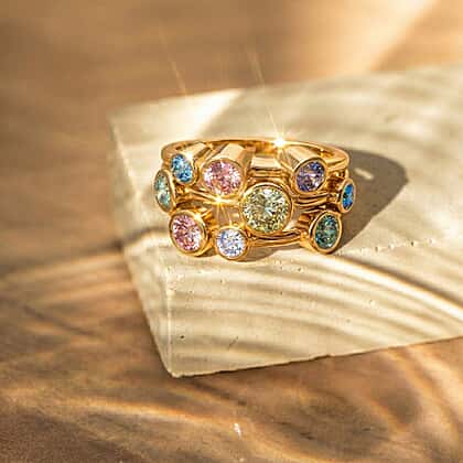 Designed with an integrated stacked-look profile, this bubble-set diamond ring delivers the impact of multiple bands in a single, sculptural piece. Raised rows sweep across the top, scattered with rounded bezel settings that resemble floating droplets of light. Features SI clarity Lab-grown diamonds in yellow, pink, white, green and blue create a soft watercolour blend, while the mix of stone sizes builds depth and dimension across the finger. Crafted in a rich yellow gold tone, this offers lasting durability and warm tone shine. The open gallery beneath adds detail and keeps the ring comfortable for longer wear. It’s a statement style that instantly completes your look.