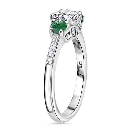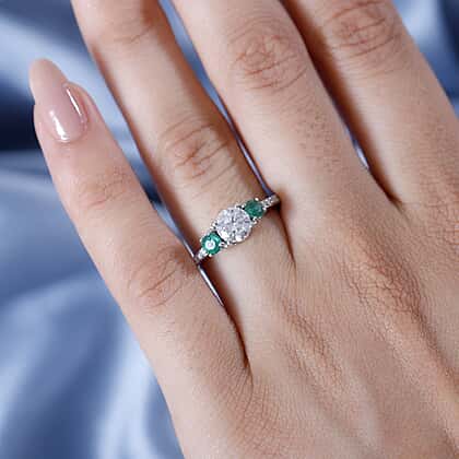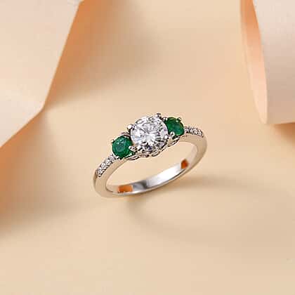 Three radiant gemstones come together in a harmonious trilogy setting of the Moissanite Consort Ring. The ring has been crafted with a white moissanite centre stone and accented by AAA Gemfields Zambian Emeralds. The shank is beautifully designed with its undergallery depicting a blooming rose in Platinum Overlay Sterling Silver.