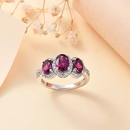 Embrace the magnificence of a Natural Ember Garnet Trilogy Ring accented by a halo of Natural White Zircons in this ring showcasing a Victorian era design. The regal charm of the ring lies in the placement of three oval-shaped garnets in prongs surrounded by a glittering string of moissanites in Rhodium Overlay Sterling Silver.