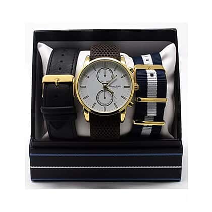 Thomas Calvi White Dial Mens Quartz Watch Gift Set with Interchangeable Straps in Gold Tone