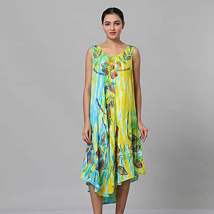 Tie & Dye Blue and Yellow Umbrella Dress in Floral Pattern (Size upto 18) Length - 120cm-47in
