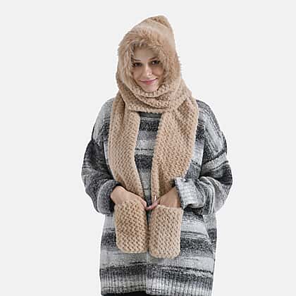 Step into the chill with effortless style wearing this 3-in-1 hooded scarf with mittens in warm brown. Crafted from soft faux fur polyester, it provides plush comfort while keeping you snug from head to hands. The clever all-in-one design acts as a hood, scarf, and mittens, offering maximum warmth without the bulk. Perfect for layering over jumpers or coats, its earthy tone complements any winter outfit. Measuring 2.2 metres long, it ensures complete coverage while remaining lightweight and easy to wear – a practical yet chic essential for autumn and winter adventures.