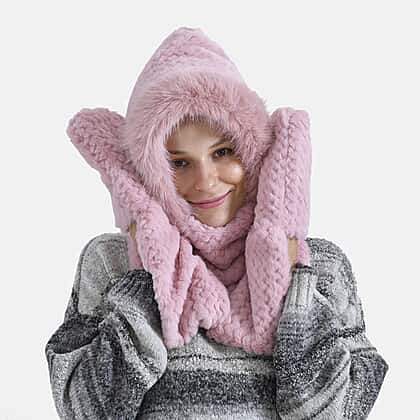 Add a playful touch to your winter wardrobe with this 3-in-1 hooded scarf with mittens in delicate pink. Combining functionality and charm, it keeps you warm while looking effortlessly elegant. Made from 100% polyester faux fur, it feels wonderfully soft against the skin and ensures full protection from the cold. The integrated design covers your head, neck, and hands in one go, making it ideal for daily outings or travel. Lightweight yet insulating, this pastel-toned accessory pairs beautifully with neutral or dark coats, bringing warmth and femininity to frosty days.